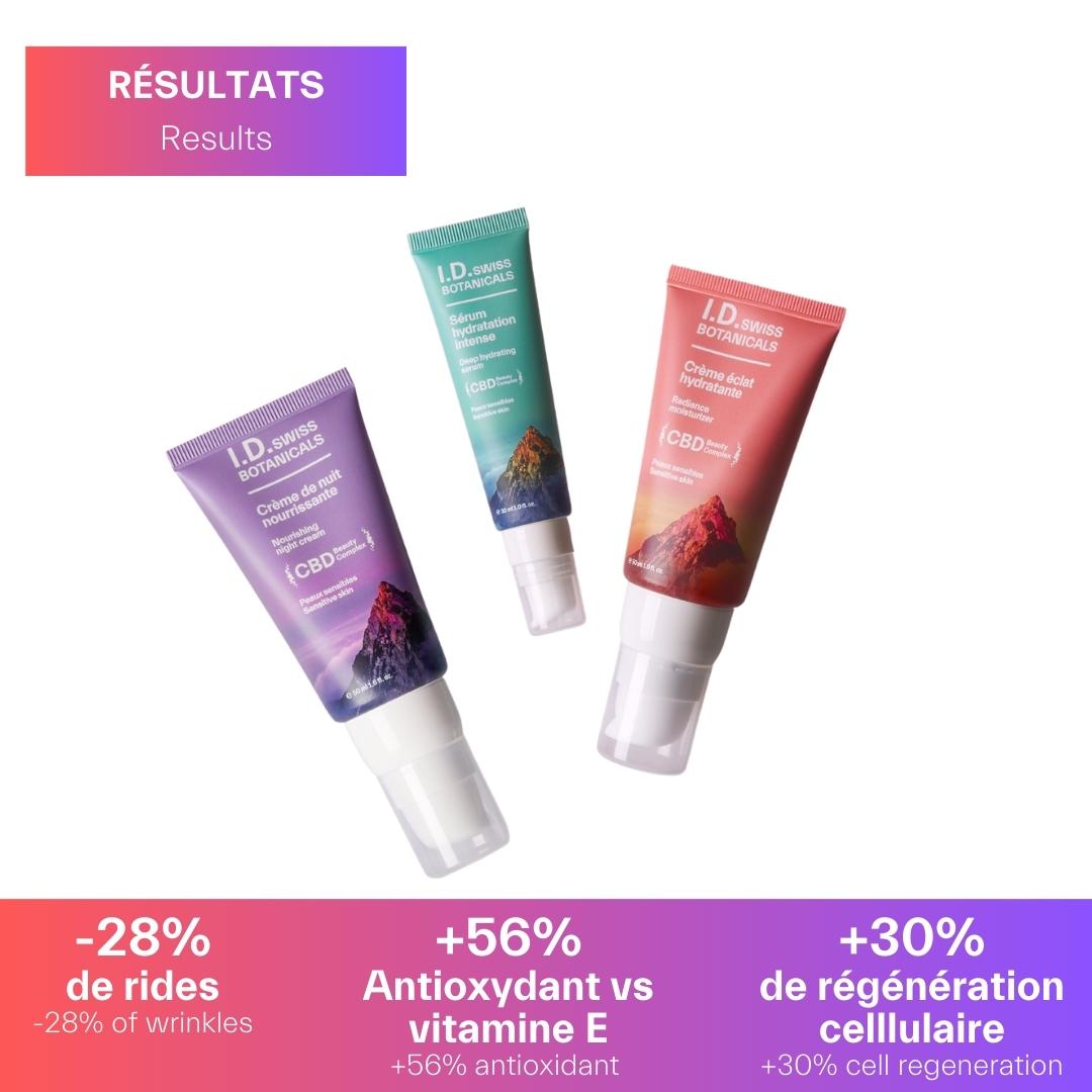 - CBD SUISSE : Actif apaisant, anti-inflammatoire (réduit les rougeurs, combat l’inflamm’aging) et séborégulateur qui permet de rééquilibrer le microbiome de la peau. Diminue la sensibilité cutanée et améliore la régénération cellulaire et la cicatrisation.